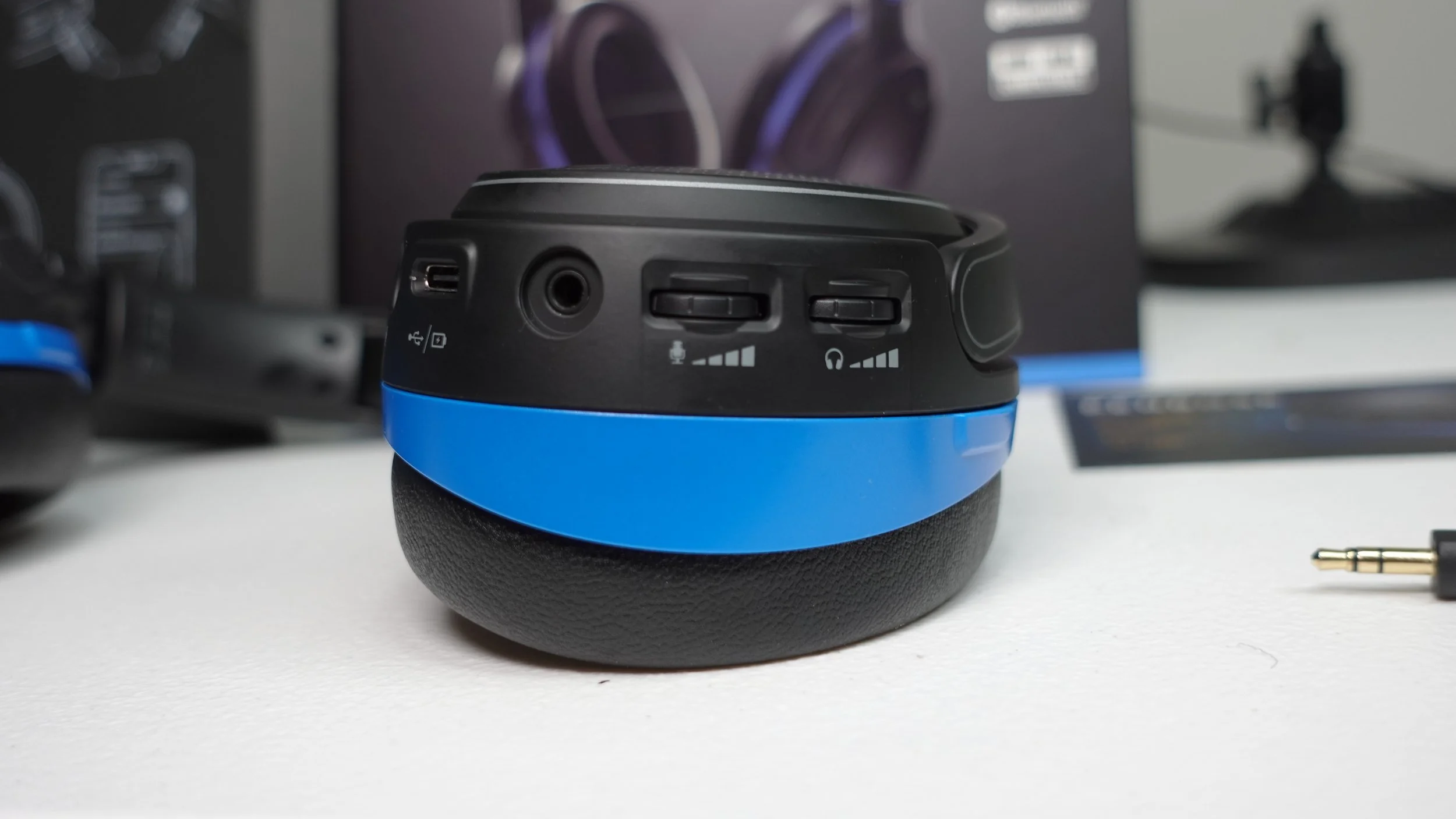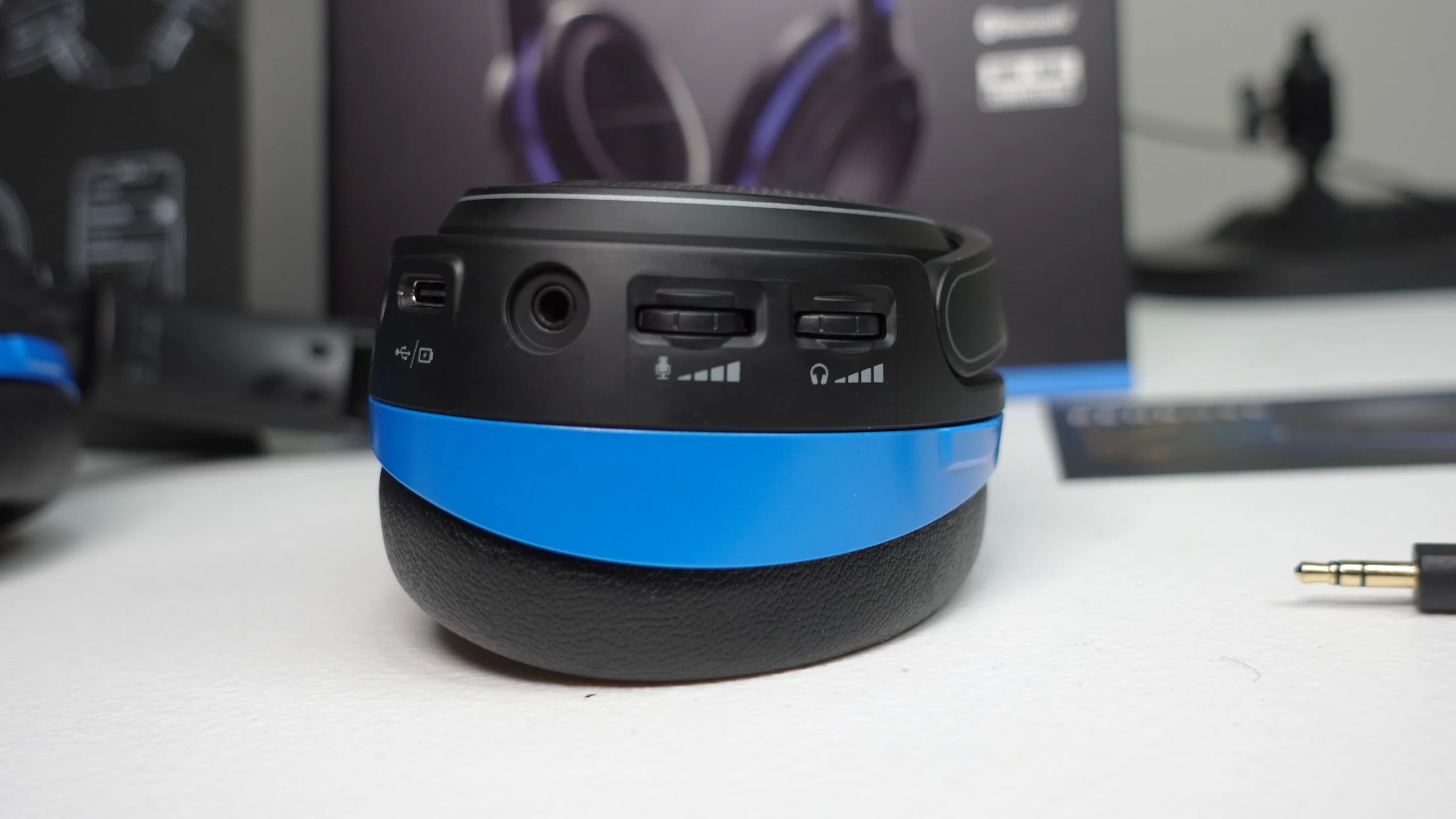 Next to the mic port, there's a blue button that lets you change the connection. You can switch between: USB 2.4 GHz wireless, Bluetooth and 2.4 (dual wireless), Bluetooth alone, or auxiliary cable.