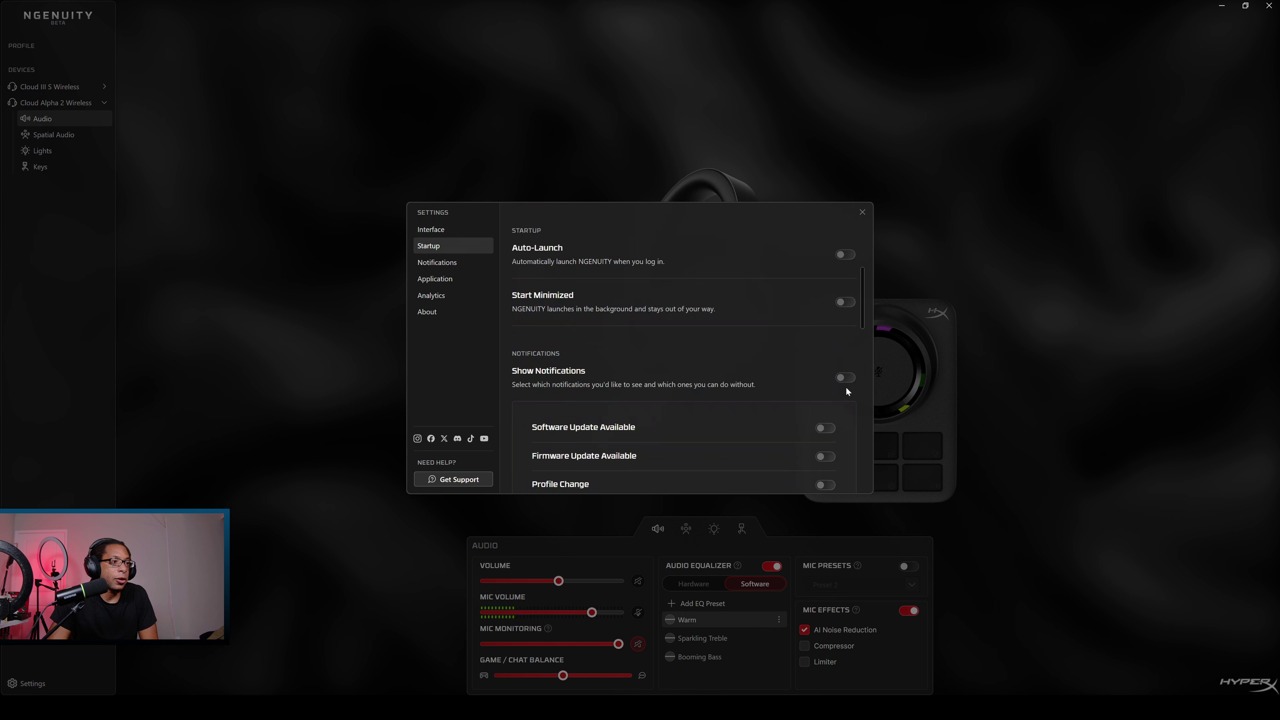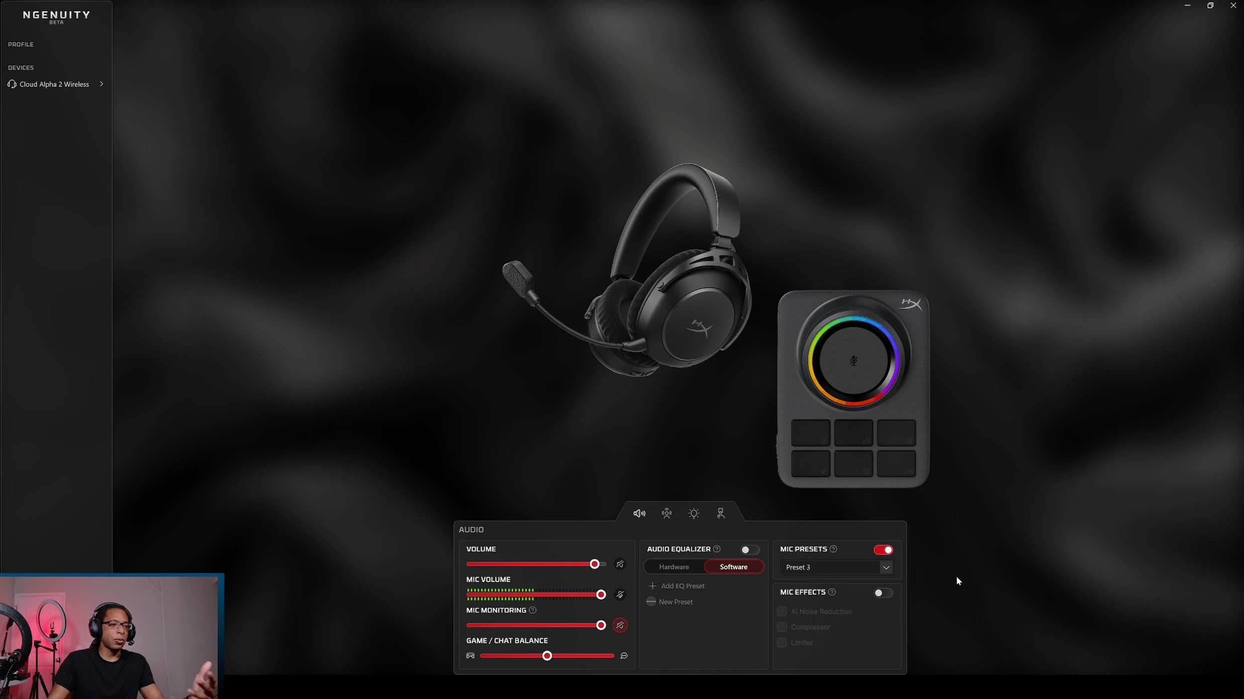This is my biggest issue with the Alpha 2. The software it uses is HyperX NGENUITY. Specifically, the beta version of the software - it doesn't even work with the older version which is now referred to as the legacy download.