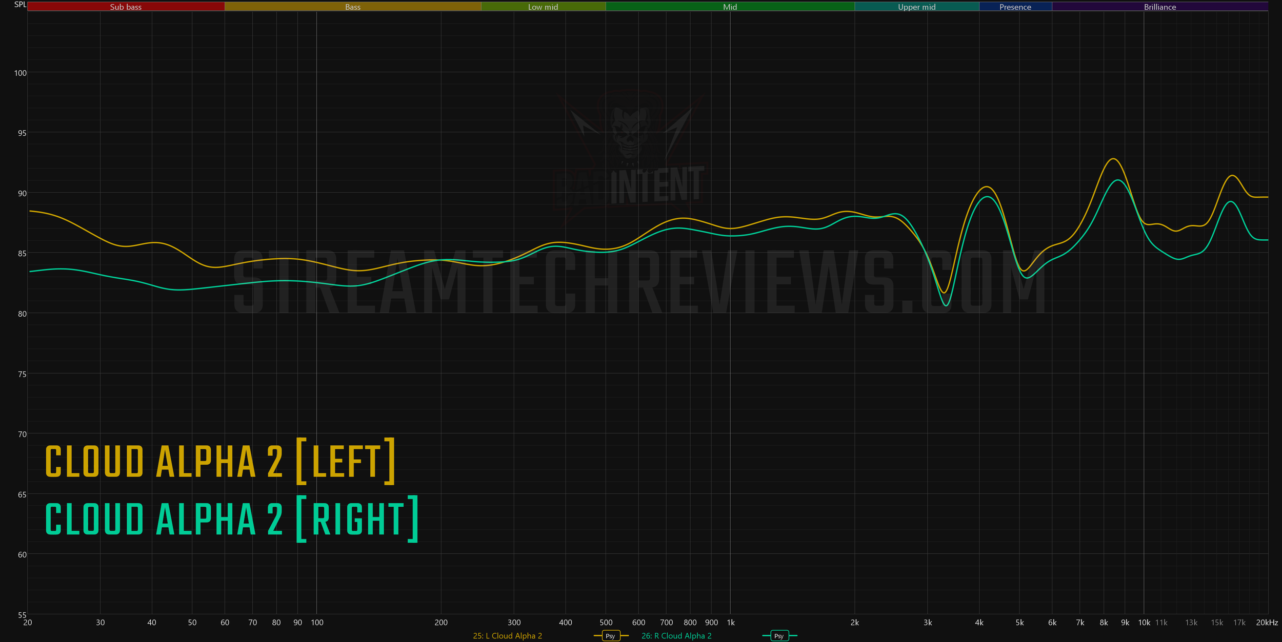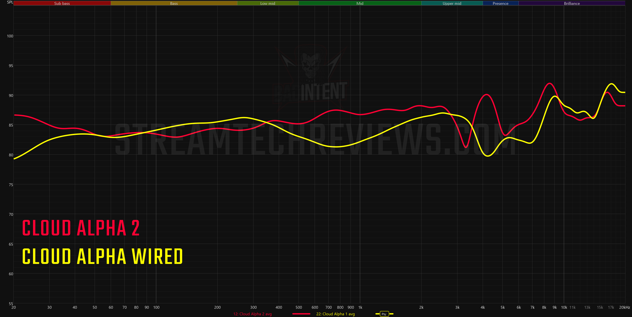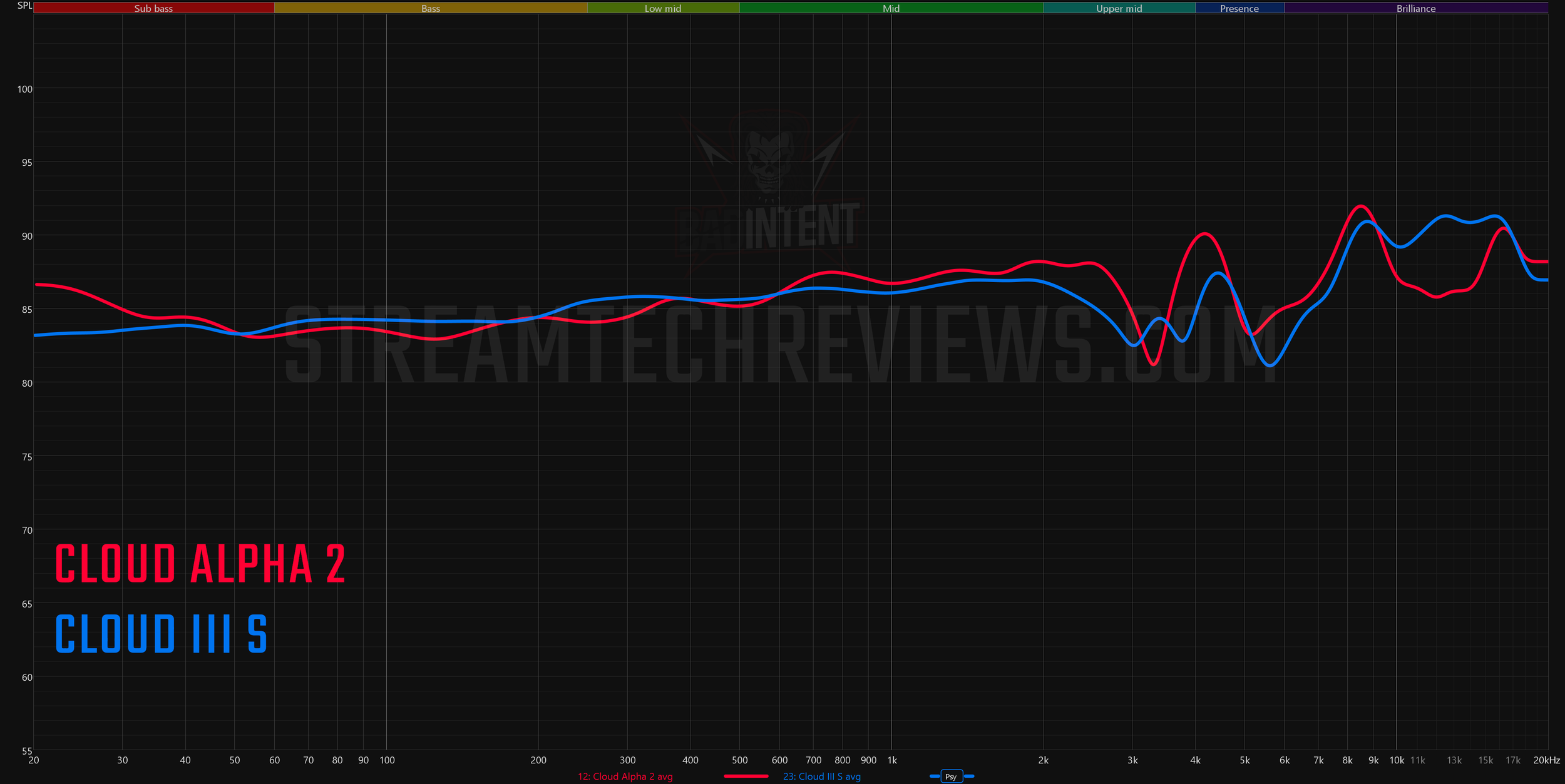 In comparison to the Cloud III S, the Alpha 2 has more bass and sub-bass. There's still very little power down there, but the Cloud III S basically just punts on the low frequencies.