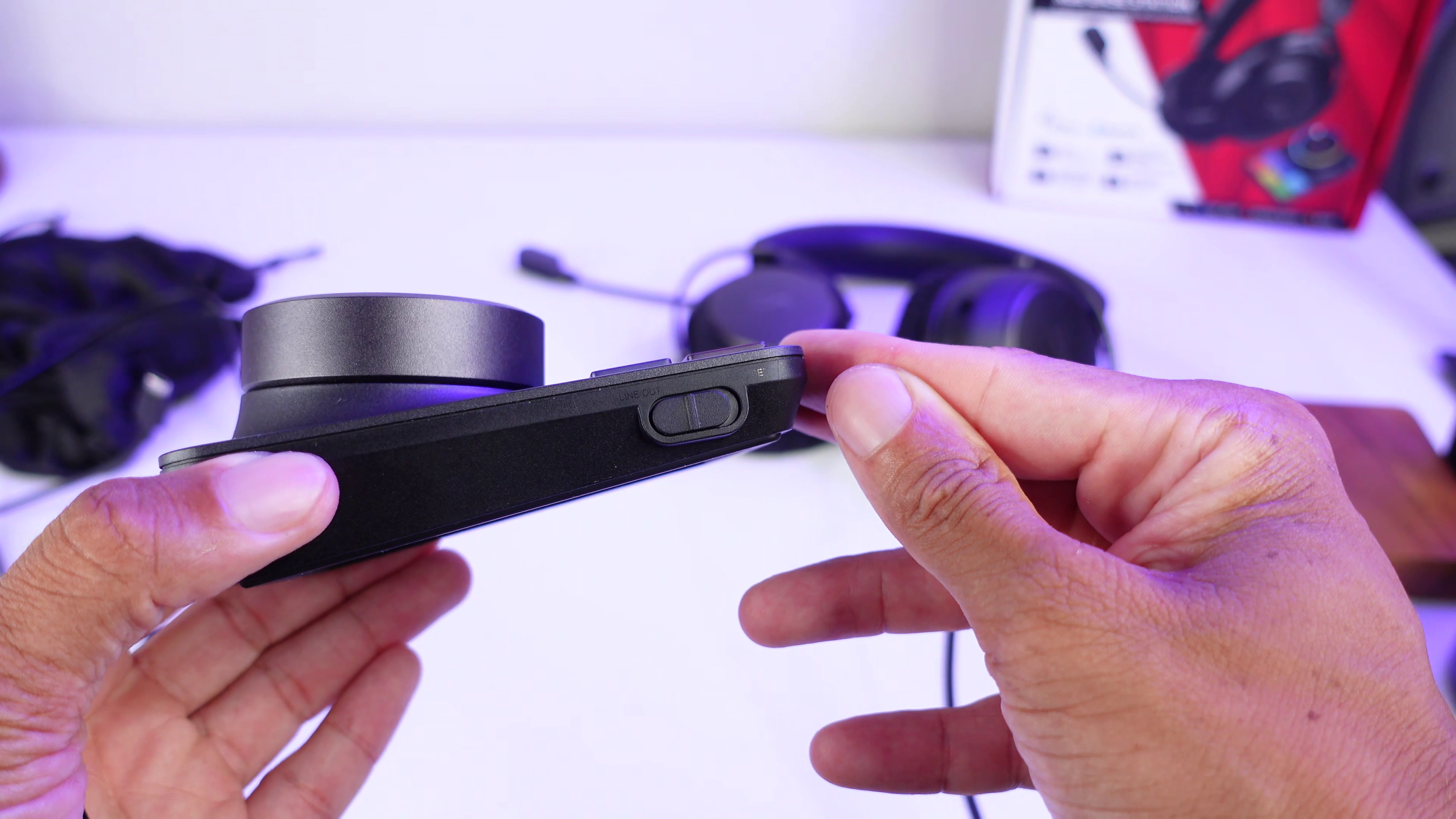 There's one more function on the side that switches the outgoing audio to either the headset using wireless connectivity or to the line out port.