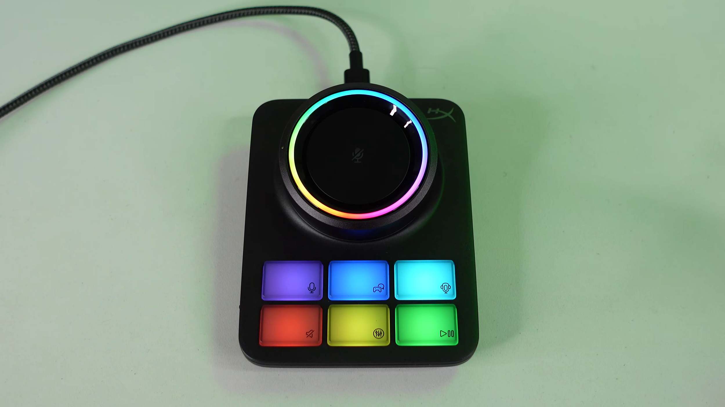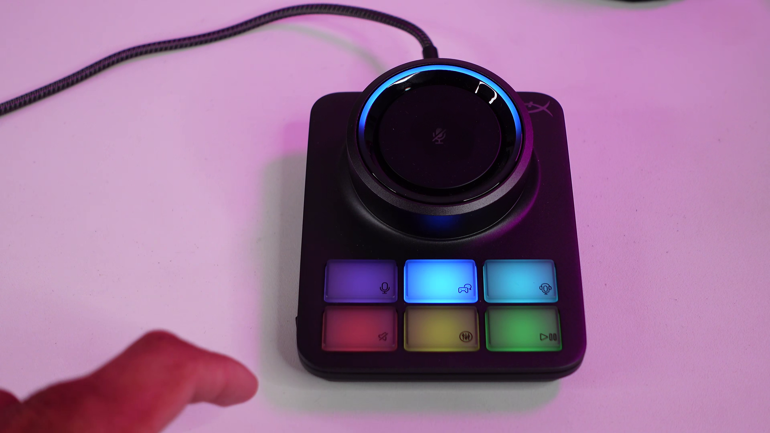The big infinite scroll wheel is for volume by default. This is independent of system volume. The middle capacitive button is mic mute. The rest of the buttons are physical. Like the Elgato Stream Deck (before the clicky keys came out), they’re quite mushy. The light color of the buttons cannot be changed currently.
