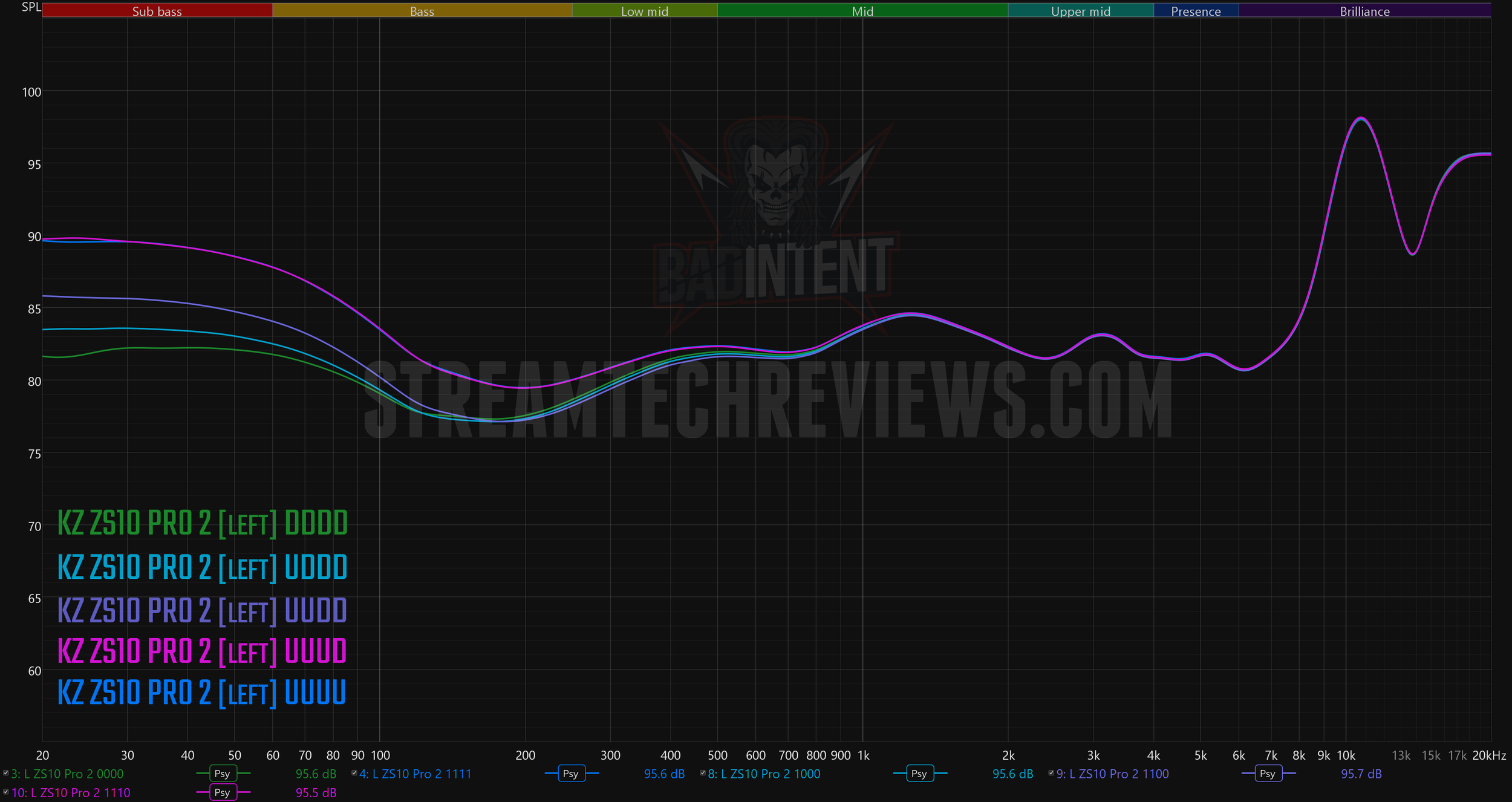 The most interesting part of the ZS10 Pro 2 is the physical tuning switches. In the graph above, I’ve labeled a measurement with the switch on as “U” for up and “D” for down if it’s off. The only switch that didn’t seem to do anything for me at all is #4.